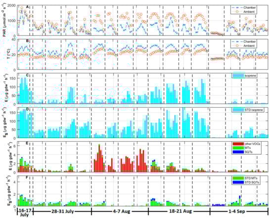 Measurements with branch chambers in 2016. (A) PAR (μmol m−2 s−1) values for chamber condition (PARC, blue cross and dashed line) and ambient condition (red circle and dotted line). (B) Temperature (°C) values for chamber condition (TC, blue cross and dashed line) and ambient condition (red circle and dotted line). (C) Emission rates (μg gdw−1 h−1) for isoprene (cyan). (D) Standardized (STD) emission rates (μg gdw−1 h−1) for isoprene (cyan). (E) Emission rates (μg gdw−1 h−1) of other VOCs (red), monoterpenes (MTs, green), and sesquiterpenes (SQTs, blue). (F) STD emission rates (μg gdw−1 h−1) for MTs (green) and SQTs (blue). Vertical dashed lines separate the different days. Each bar represents individual measurements.