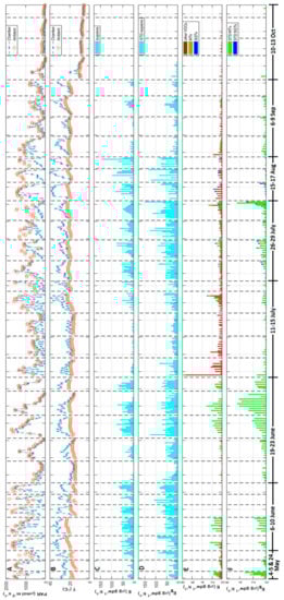 The seasonal trend for measured and STD isoprene emissions in 2016 showed an increase from spring to summer; thereafter, it decreased from late summer to mid-autumn. The average STD isoprene emission in 2016 was 30.6 (±26.7) μg gdw−1 h−1 and the average TC and PARC were 23.2 (±7.6) °C and 521 (±444) μmol m−2 s−1. The measured isoprene emission varied from 50.1 to 143.7 μg gdw−1 h−1 between June and August but emissions up to 46.5 μg gdw−1 h−1 were already observed in May (Figure 2C). All measured isoprene emission rates >50 μg gdw−1 h−1 in 2016 had corresponding TC and PARC ranging from 26.8 to 39.9 °C and from 365 to 1518 μmol m−2 s−1. The STD isoprene emission peaked (150.0 μg gdw−1 h−1) in late July 2016, while the measured isoprene emission peaked (143.7 μg gdw−1 h−1) in August. Isoprene emissions were negligible during the last campaign in October, when TC and PARC were low (less than 11 °C and 110 μmol m−2 s−1, respectively).