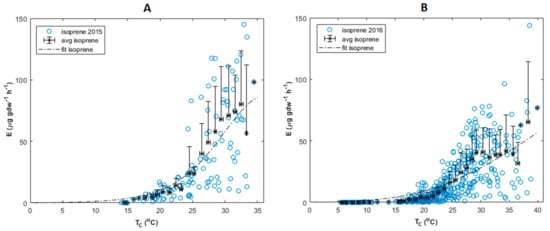 The influence of TC on the isoprene emission rates showed a stronger exponential increase for the variety on P1 than for Tora on P2 (Figure 3). In particular, when TC reached above 23 °C, the average emission in 2015 increased faster than during 2016. The steeper response in 2015 was possibly due to the fact that this variety was a stronger emitter of isoprene, but the unexpected lower average emission when TC varied from 30 to 36 °C in 2016 also reduced the slope of the fitted curve this year.