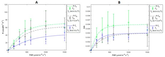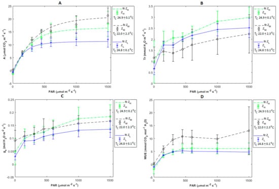 The average net assimilation at the maximum light intensity (1500 μmol m−2 s−1) at zM (21.30 ± 2.92 µmol CO2 m−2 s−1) and zH (18.10 ± 4.89 µmol CO2 m−2 s−1) was higher than at zL (12.05 ± 3.01 µmol CO2 m−2 s−1) (Figure 7A and Table 6). The average A values for each light step for zM and zH increased all the way up to 1500 μmol m−2 s−1, while the average A for zL leveled out when PAR exceeded 600 μmol m−2 s−1. (Figure 7A and Table S9).