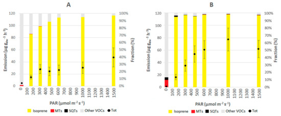 Total emission rates (μg gdw−1 h−1, mean ± SD, black circles and left y-axis), and the percentages (stacked bars and right y-axis) for the different BVOC groups at different light levels (μmol m−2 s−1). (A) Lower height (zL, n = 3). (B) Higher height (zH, n = 5).