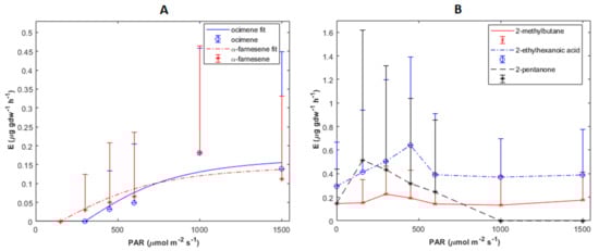 (A) Emissions (μg gdw−1 h−1, mean + SD, n = 11) for ocimene (blue circles) and α-farnesene (red stars) from height levels zM and zH at different light levels. Fitted curves have been done by a modified Equation (2), where CL has been replaced with Equation (S3) for ocimene and Equation (S4) for α-farnesene (see Supplementary Materials for Equations (S3) and (S4) and Table S8 for values). (B) Emissions (μg gdw−1 h−1, mean + SD, n = 7–14) for 2-methylbutane, (red cross), 2-ethylhexanoic acid, (blue circles), and 2-pentanone (black stars) from height levels zL and zM.