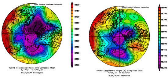 Geopotential height field at polar vortex level (100 hPa) at the beginning of the event (17 June 2021, left) and during the main impact on the Pacific Northwest (26–28 June 2021, right). Note that the legend is the same for both maps. Images are from NOAA/ESRL plotting routines based on the NCEP/NCAR reanalysis.
