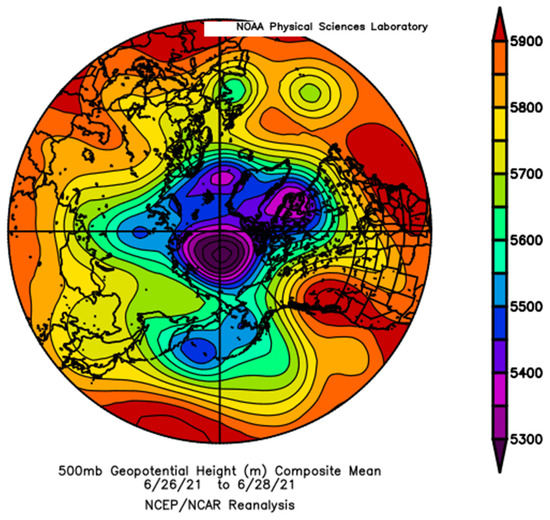 The severe weather event of June 2021 in the Pacific Northwest (PNW) started mid-month with the split in the polar vortex into two centers. The 100 hPa level geopotential heights over the Bering Sea rapidly formed a closed feature on 17 June 2021 (Figure 2, left). Data are from the NCEP/NCAR reanalysis. Also seen in this early figure is a development of a Rossby wave meander over the Sea of Japan. Subsequently, this closed feature expanded to the east, extended along the west coast of North America with a region of higher heights over the PNW, and persisted for three days: 26–28 June 2021 (Figure 2, right). At the 500 hPa level, high geopotential heights are observed in a vertical alignment with the 100 hPa ridging (Figure 3). This ridge featured a maximal 500 hPa geopotential height of ~5980 m that is unprecedented for this area of western North America for the period from 1948 through to June 2021. Such a feature is termed an Omega Block weather pattern, and it contributed to the persistence of the heating event. Omega Blocks are a combination of two lows with one blocking high between them oriented west to east.
