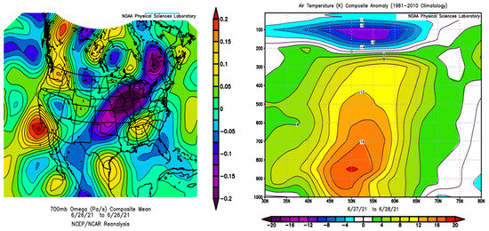 (left) Subsidence estimates (Pa/s) during 26 June 2021 for the North American west coast based on the Omega equation [5]. Positive values are downward motions. (right) Anomalies of air temperature on a south-north vertical cross-section along 122° W longitude. Maximum values of 16 °C were above the surface in the lower troposphere. Images from NOAA/ESRL plotting routines based on the NCEP/NCAR reanalysis.