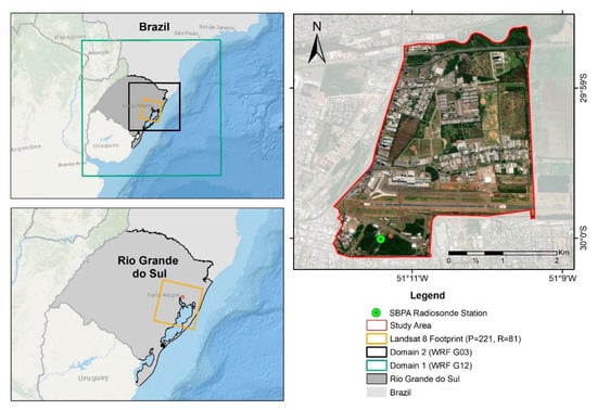 The Porto Alegre International Airport (SBPA), Rio Grande do Sul State, Brazil was selected as the study area. The airport includes a radiosonde station, which made this site a useful environment for studies that aimed to evaluate atmospheric profiles. The selected area covers the official limits of the Anchieta district [70], with an area of around 9.2 km2 (Figure 1). According to Köppen’s climate classification, the local climate is subtropical humid with hot summers (Cfa) [71], with a mean annual air temperature of 19.6 °C, mean annual relative humidity of 76.1%, and mean annual precipitation of 1397 mm [72].