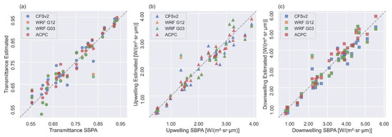 Figure 2. Comparison of (a) atmospheric transmittance, (b) upwelling radiance, and (c) downwelling radiance calculated with SBPA in situ radiosondes and estimated profile sources. The dashed line represents the “1:1 line”.