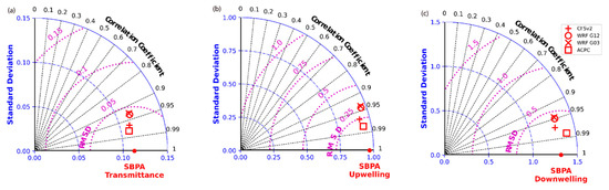 Figure 3. Taylor diagrams of (a) atmospheric transmittance, (b) upwelling radiance, and (c) downwelling radiance. The parameters calculated with SBPA radiosondes are the references. The black dashed lines represent the correlation coefficient (R), blue dash-dot lines represent the standard deviation, and the magenta dotted lines represent the root mean squared deviation (RMSD = RMSE).