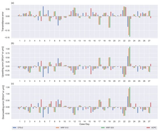 Figure 4. Errors in the estimation of (a) atmospheric transmittance, (b) upwelling radiance, and (c) downwelling radiance from the different profiles for each case day.
