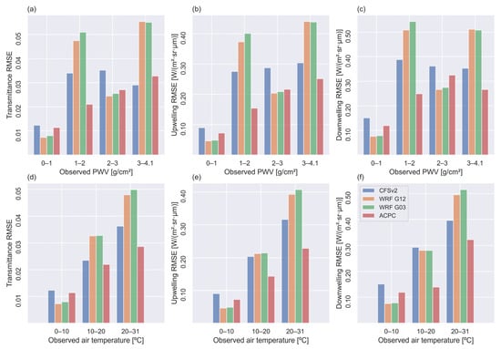 Figure 5. Atmospheric parameters’ RMSE values calculated for specific ranges of observed precipitable water vapor (PWV) (ac) and air temperature (df).