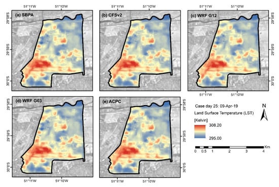 Figure 6. LST images retrieved with atmospheric parameters from (a) SBPA, (b) CFSv2, (c) WRF G12, (d) WRF G03, and (e) ACPC, for case day 25 (9 April 2019).