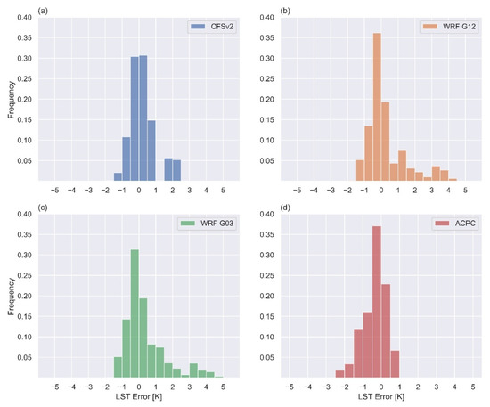 Figure 7. Normalized histograms of the LST errors using profiles from (a) CFSv2, (b) WRF G12, (c) WRF G03, and (d) ACPC.