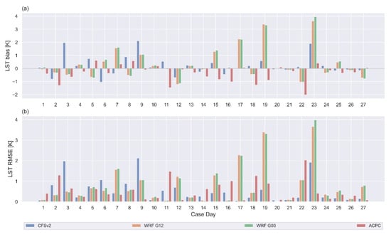 Figure 8. LST (a) bias and (b) RMSE for each case day.