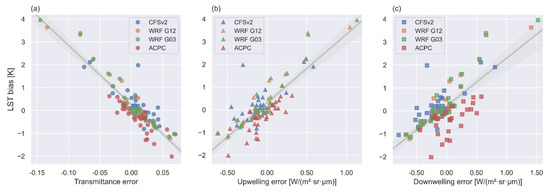 Figure 9. Relation of daily LST bias with errors in (a) transmittance, (b) upwelling, and (c) downwelling radiances for each case day. The gray line represents the linear regression for all data.