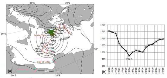 Surface explosive cyclogenesis occurred near the Gulf of Sidra (Figure 2c) with a surface pressure deepening of almost 16 hPa during the 12 h period between 27/12 UTC and 28/00 UTC and a central pressure of about 998 hPa at 28/06 UTC (Figure 1b), following the Capaldo and Conte (CC) mechanism []. The cyclone is characterised as explosive, following the criterion of [], in terms of normalized central pressure deepening rate (NDRc) []. In our case, the criterion of the 12 h deepening rate was used, where the 12 h time interval was successive and overlapping every 6 h to obtain a more detailed evolution of the deepening rate of the system [].