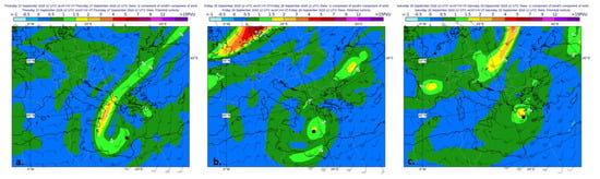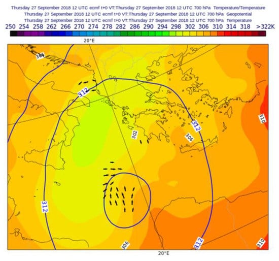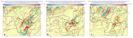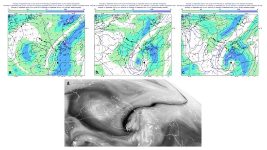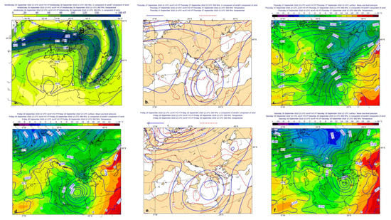 For this study, ERA-Interim datasets [] on a 0.125° × 0.125° regular latitude–longitude grid, interpolated from the respective spectral resolution T255 (0.75° × 0.75° km) at 6 h intervals, were employed. The examined region extends from 24° N to 64° N and from 30° W to 50° E. Analysis fields at 6-hourly intervals from 26 September 2018 00 UTC to 30 September 2018 12 UTC were selected. The data were retrieved at mean sea level, on pressure levels and isentropic levels and, on the level of the dynamic tropopause (2 PVU).