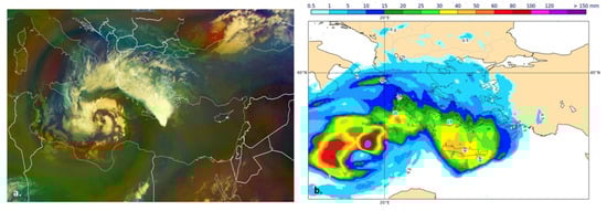 The Mediterranean tropical-like cyclones, known as medicanes [], are intense low-pressure systems that exhibit some distinct features of tropical cyclones, such as a cloud-free area at their centre (the ‘eye’), spiral bands with deep convection around it, intense surface winds and a warm-core and symmetric structure []. They are meso-scale cyclones, with diameter, usually less than 300 km, and intensely low sea level pressure [,]. Medicanes form over the sea in autumn and winter, mainly in the western Mediterranean and the Ionian Sea [], causing hazardous weather phenomena, such as strong winds, heavy precipitation and thunderstorms, tornadoes, storm surges with severe damages in properties, agriculture, communication networks and loss of human lives [].