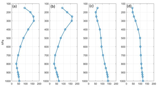 Temporal variation of the vertical profile of  (i.e., the difference between maximum and minimum value of geopotential height at a specific isobaric level within the employed circle with a radius of 200 km) at (a) 27/06 UTC, (b) 27/12 UTC, (c) 28/06 UTC, and (d) 28/12 UTC.