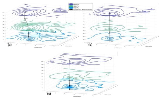 Three-dimensional representation of the geopotential height distribution around the cyclone centre at 900 hPa (light blue), 600 hPa (green) and 300 hPa (dark blue) at (a) 27/18 UTC, (b) 28/06 UTC, and (c) 28/18 UTC. Black dots represent the minimum value of geopotential height at each isobaric level and black line represents the vertical tilt with height (in meters).