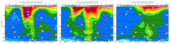 Moreover, the distributions of PV on 315 K (Figure 8a) exhibited an extended PV streamer that represents the equatorward intrusion of stratospheric high potential vorticity air (see also Figure 3b), and a cold tropopause anomaly upstream the surface cyclogenesis on 27 September, which further contributed to the explosive deepening []. In fact, a PV streamer is identified in Figure 8a, which is a pattern which favours the formation of Mediterranean cyclones []. The cross-section of the meridional wind component, potential temperature, and PV along the constant-latitude 33.5° N at 27/12 UTC (Figure 9a), following the surface cyclone centre, verifies this deep intrusion of the stratospheric air in the troposphere to the level of 500 hPa and a cold-core structure with isentropes bending upwards below 500 hPa. It is apparent that the high-PV air descended at low latitudes (33.5° N–15° E) at the PFJ flanks, interacting with the low-level baroclinicity over the African continent. Thus, the upper-level dynamics during the first phase are favourable for the development of an explosive cyclone in conjunction with the low-level baroclinicity [].