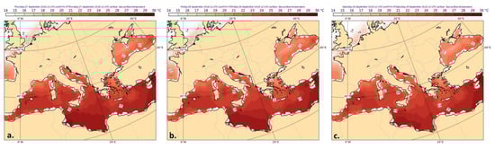 Sea surface temperature (SST; in °C) for (a) 27/12 UTC, (b) 28/12 UTC, and (c) 29/12 UTC.