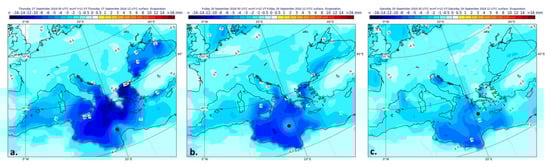 The sea surface temperature (SST) between the Gulf of Sidra and the Libyan coasts varied between 26–28 °C, one day before the onset of the explosive deepening at 26/06 UTC (not shown) and remained as high as 26–27 °C during the explosive cyclogenesis at 27/12 UTC (Figure 11a). In association with the strong cold-air advection occurring over the Mediterranean, the warm sea surface enhanced the air-sea interaction and the respective turbulent sea surface fluxes [], resulting in a significant enhancement of evaporation (i.e., transfer of energy from the sea to the atmosphere) (Figure 12a) after 26/12 UTC over the Central Mediterranean, contributing to the surface explosive deepening.