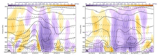 To further elaborate this evidence, the vertical cross-sections of wet-bulb potential temperature, vertical velocity (omega), relative humidity and winds at 27/12 UTC (Figure 13a) were examined providing a picture for the existence of a well-defined WCB ahead of the cold front. Indeed, a pronounced zone of ascent is evident between 20° E–25° E, with a relative humidity of about 90%. Furthermore, a cyclonic wind shift in the lower troposphere up to about the 800 hPa isobaric level became evident, while a respective anticyclonic wind shift formed in the layer 700–300 hPa [,]. The wet-bulb potential temperature  increased with height forming a warm tongue from the lower to the upper levels.