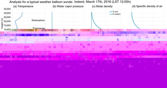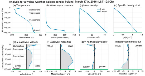 Weather balloons, with data records maintained at NOAA NCEI’s (https://www.ncdc.noaa.gov/data-access/weather-balloon/integrated-global-radiosonde-archive, accessed on 10 November 2020) Integrated Global Radiosonde Archive (IGRA) [3,5,77], have been routinely launched from more than 1000 weather stations around the world, between 1 and 4 times a day, since the 1950s or so. These balloons provide pressure (P), temperature (T), horizontal wind velocities, and water content measurements throughout their vertical ascent through the troposphere, tropopause, and stratosphere until they burst (typically at ~30–35 km altitude). In Figure 1, we illustrate how to use these measurements to derive the atmospheric mass flux profiles for a typical weather balloon sounding (Ireland, 17 March 2016, 12:00 LST). Figure 2 presents the same results as Figure 1 but uses height/altitude as the y-axis instead of atmospheric pressure.