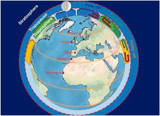 The rationale for our particular station choice was to select five stations located roughly along the same meridional line but covering low to high latitudes to sample the atmospheric circulation regimes nominally described by the Hadley, Ferrell, and Polar circulation cells within the same approximate geographical region, i.e., the European/African North Atlantic sector. Details on these five stations are summarized in Table 1 and the respective locations of these stations in terms of the idealized atmospheric circulation cells are presented in Figure 3.