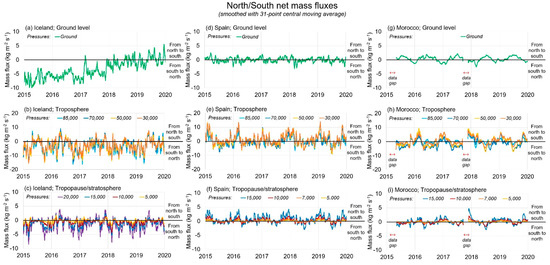 Time series of the meridional (north/south) component of atmospheric mass flux plotted from ground-level (top row), troposphere (middle row) and tropopause/stratosphere (bottom row) for (a–c) Iceland (left column), (d–f) Spain, and (middle column) and (g–i) Morocco (right column). As an aside, we found that the available data records for the north African stations tend to have relatively poor data coverage compared to the European stations. We have indicated the data gaps for Morocco, and stress that the data gaps are even more severe for Mauritania (not shown).