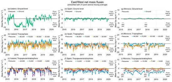 We first note that the time series at ground level (and within the boundary layer—not shown here for simplicity) are often very different from those within the rest of the troposphere and stratosphere. This is particularly apparent for the Iceland station where there appears to have been a shift from a prevailing surface southerly (south-to-north) flux in 2015 to a prevailing surface northerly (north-to-south) flux by 2019 (see Figure 4a), and an alternation between a prevailing surface easterly (east-to-west) flux in 2015 to a prevailing westerly (west-to-east) flux in 2016–2017 and back for 2018–2018 (see Figure 5a); however, this apparently did not occur for the rest of the atmosphere.