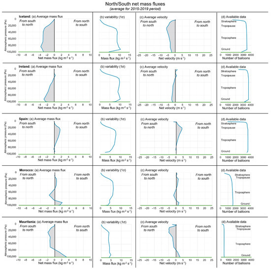 Mean vertical profile of mass fluxes and mean vertical profile of wind speed for the North-South atmospheric circulation component from ground to stratosphere. The averages are obtained over the 2015–2019 interval covering all five stations (Iceland, Ireland, Spain, Morocco, and Mauritania) within the three circulation cells paradigm of atmospheric physics. (a) average mass flux from south to north; (b) variability; (c) average velocity from south to north (d) available date.