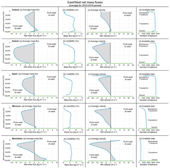 The cohesiveness of the changes in mass flux throughout the atmosphere (with the exception of the surface and lower troposphere) is even more apparent from the analysis plotted in Figure 6 and Figure 7. Figure 6 shows the 5-year (2015–2019) time-averaged vertical profile with respect to atmospheric pressure of: (a) the average meridional (north/south) mass fluxes; (b) one standard deviation of the variability; (c) mean meridional wind speed; and (d) the number of balloon profiles available for the five selected stations, i.e., Iceland, Ireland, Spain, Morocco, and Mauritania (from the top row to bottom, respectively). Figure 7 shows the equivalent results for the zonal (east/west) fluxes and wind speeds.
