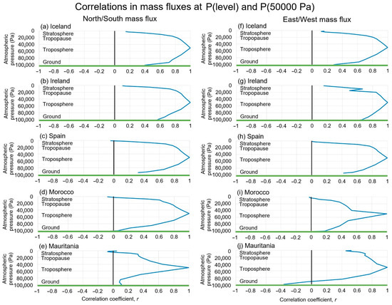 Figure 8 shows an alternative approach to describing the data. For each station, we have calculated the correlation coefficient (r) between the daily mass fluxes at each mandated level and that at 50,000 Pa (500 hPa) over the entire 5-year period. r, can vary between 1 (exactly correlated) to 0 (completely uncorrelated) to −1 (exactly anti-correlated). The panels on the left show the results for the meridional (north/south) mass fluxes, while those on the right show the zonal (east/west) results.