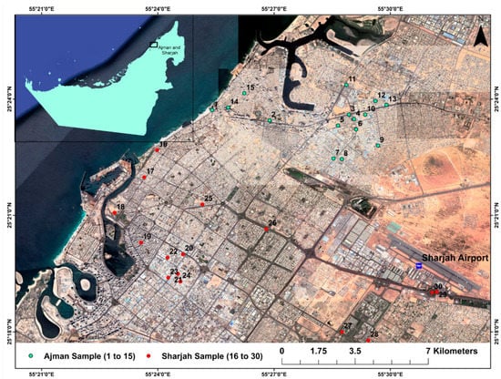 Sharjah is the third emirate in the UAE, in terms of population number. Sharjah city, the capital of this emirate, is situated at 25°21′27″ N latitude and 55°23′27″ E longitude. Ajman is the fifth largest emirate in the UAE, and its capital, with the same name, is located at 25°24′49″ N latitude and 55°26′44″ E longitude (Figure 1).