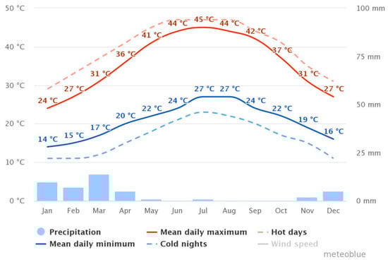 The articles [21,25] present an extensive analysis of the climate in the region. Still, we summarize here some aspects related to the climate in the Sharjah and Ajman emirates. The study area belongs to a hot desert with warm winters and scorching and humid summers. Rainfall is generally light and erratic and occurs almost entirely from November to April. About two-thirds of annual precipitations fall in February and March [43].