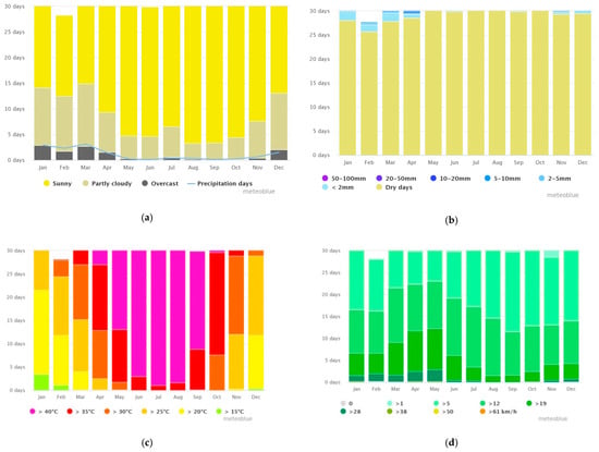 The chart from Figure 2 presents the average temperatures and precipitation evolution. Figure 3 shows the cloudy, sunny, and precipitation days, precipitation amounts, maximum temperatures, and wind speed recorded at the Sharjah International Airport. Two sampling sites are situated nearby (29 and 30).