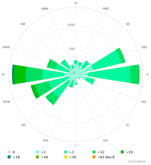 The wind rose for Sharjah International Airport (Figure 4) shows that most often throughout the year the wind blows from west to east or east to west, with speeds between 12 and 19 km/h.