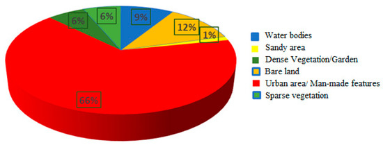 Results of the land-cover analysis (Figure 5 and Figure 6) show that 66% of the study area (187.61 km2) mostly includes urban area/human-made features, which includes industrial sites, petrol pumps, hotels, tourist areas, residential and commercial buildings, airport, etc.