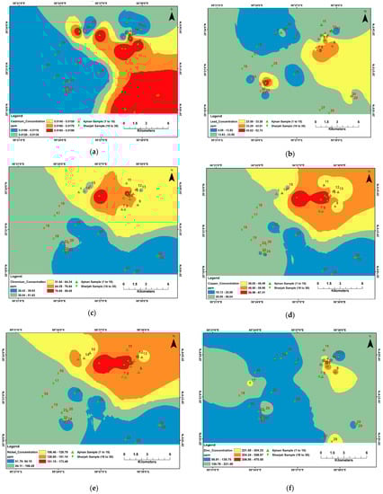 Maps showing the concentrations of (a) Cd, (b) Pb, (c) Cr, (d) Co, (e) Ni (f) Zn in the study area.