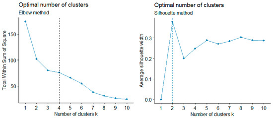 The series containing the pollutants concentrations recorded at each site were normalized, and the silhouette and elbow methods (Figure 8) were used to determine the optimal number of clusters. Based on them, k was found to be 2 and 4.