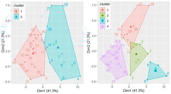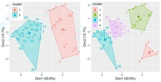 Clusters determined by the k-means algorithm with k = 2 (in the left) and k = 4 (in the right), based on the pollutants’ concentrations.
