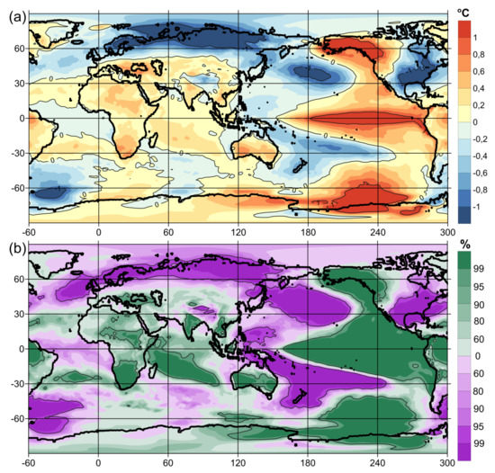 The authors of [43] present the global spatial structures of the cross-correlations between the Southern Oscillation (SO) index and SPL anomalies. These structures were more pronounced over oceans than over continents, and most of their features were found to be stable, although climatic changes, such as the climatic shift of 1976/1977, apparently changed some important teleconnections of ENSO. Global structures of cross-correlations between the SO index and near-surface temperature (NST) anomalies show striking symmetry about the equator. The features of these characteristic El Niño structures underline the associated extensive warming in the tropics of the central and eastern Pacific Ocean, as well as along the western coasts of the Americas up to the high latitudes of the Pacific Ocean in both hemispheres, and cooling in the central regions of the northern and South Pacific.
