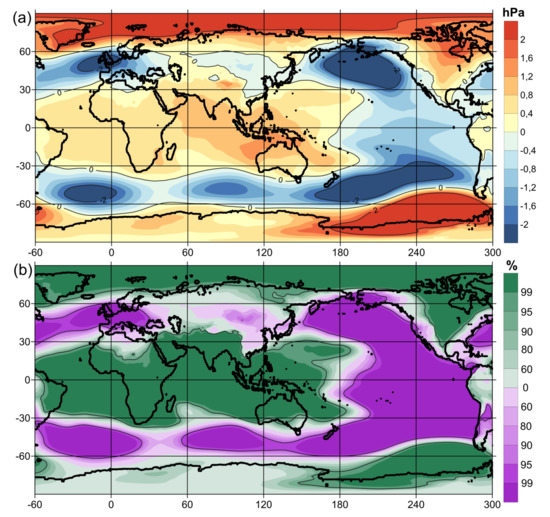 The difference in average atmospheric sea-level pressure anomalies between the opposite phases of the Global Atmospheric Oscillation by GAO2 index (a). The probability values for (a) according to Student’s t-test (b).
