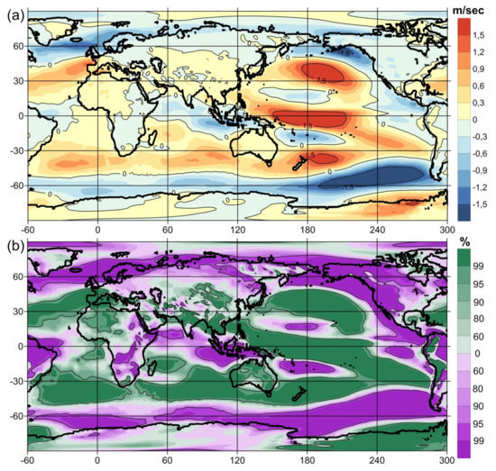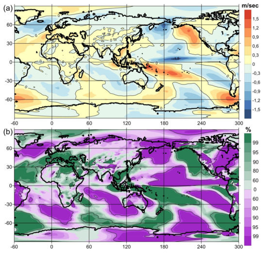 The difference between the average anomalies of the zonal (direction from west to east) wind speed component at a height of 10 m from the surface between the opposite phases of the Global Atmospheric Oscillation by GAO2 index (a). The probability values for (a) according to Student’s t-test (b).