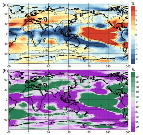 The difference in average total cloud cover anomalies between opposite phases of the Global Atmospheric Oscillation by GAO2 index (a). The probability values for (a) according to Student’s t-test (b).