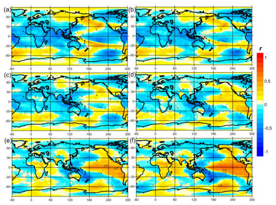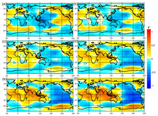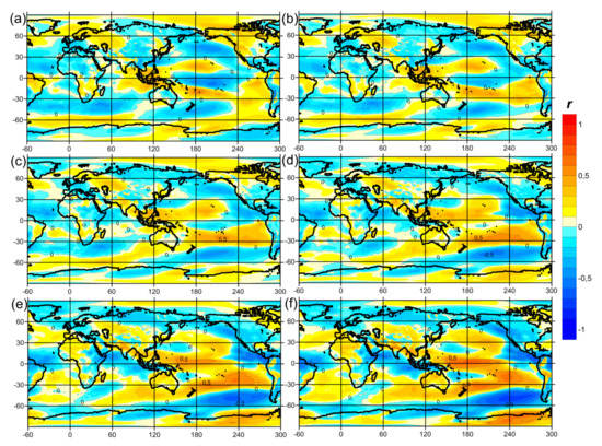Cross-correlations between 14-month (a), 12-month (b), 10-month (c), 8-month (d), 6-month (e) and 4-month (f) shifts in sea-level pressure anomalies and the Global Atmospheric Oscillation Index (GAO2) with band-pass filtering from 2 to 7 years.