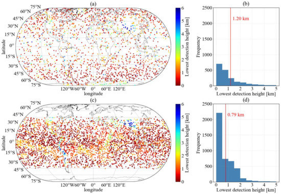 The location of RO profiles (a) for COSMIC on 15 October 2008 and (c) COSMIC-2 on 15 October 2020. (b) and (d) show the statistical histograms of the lowest detection height corresponding to (a) and (c), respectively. The red vertical line represents the mean of the lowest detection height.