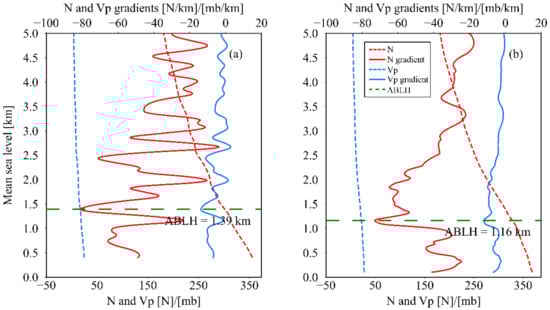 N, Vp, and gradient profiles for RO Profile 1 ((a) 151.50°E/17.23°N, 5 October 2007) and Profile 2 ((b) 130.64°E/11.18°N, 4 October 2020), as well as the results for the ABLH.