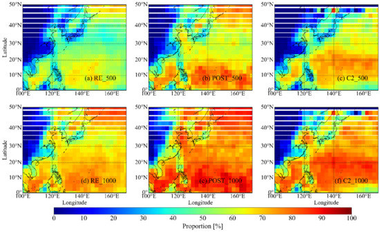 In this study, a grid with a 2.5° × 2.5° resolution was adopted in the ABLH climatology assessment using the following procedure. First, the RO profiles with “bad” quality control parameters were removed. Then, the lowest detection height of each RO profile was examined to ensure it was lower than 0.5 km over the ocean or 1.0 km over land. Finally, we co-located the RO profiles selected from the first two steps to each grid point and calculated the mean ABLH at each grid point. Figure 4 illustrates the proportion of the number of COSMIC (reprocess and post-process, RE and POST in Figure 4) and COSMIC-2 RO (C2 in Figure 4) profiles with the lowest required detection height to the number of all RO profiles co-located with each grid point. In Figure 4, “_500” and “_1000” mean that the lowest detection heights are lower than 0.5 km and 1.0 km, respectively (the prominent horizontal stripes in Figure 4 were caused by the projection method). It can be seen from all panels (a–f) that the proportions of potentially useful RO profiles were very low over land (see the blue areas, under 20%), which implies a much poorer performance in the detection of ABLH over land. Due to the undulating terrain of the land area, it is common that the altitude is higher than 500 m, so the color of most of the land area is blue. In addition, although the proportions of COSMIC-2 are slightly lower than those of post-processed COSMIC, with the lowest detection heights of <0.5 km and <1.0 km, there are still sufficient COSMIC-2 RO profiles with which to obtain more reliable ABLH climatology results, compared to COSMIC. The results for ABLH climatology will be presented in Section 3.1. Here, we need to add an explanation about why the proportions in some grids of (b) and (e) are larger than those of (c) and (f). First, COSMIC data from 2014 to 2018 were obtained from the post-processing method, which is different from the reprocessing method used from 2007 to 2013. Due to the poor quality of the COSMIC data from 2014 to 2018, more background information was added during post-processing, resulting in a decrease in the lowest detection height of some RO profiles, even lower than C2 data. Secondly, between 2014 and 2018, the quality and quantity of C1 data dropped sharply, resulting in more RO profiles with “bad” quality control parameters. The proportion in Figure 4 is the RO profiles whose lowest detection height is less than 500 m or 1000 m in all RO profiles whose quality control parameters are not “bad”. Therefore, although the proportion is large, the actual number of RO profiles is small.